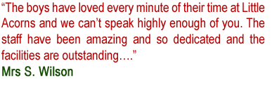 Mission statement “ We are committed to maintaining and extending high standards of care and pre school education and endeavour to meet the requirements of each and every family that uses our facilities, believing that every child in our care should be respected as an individual. Children have the right to develop at their own pace, maximising to their full potential so here at The Little Acorns Day Nursery we ensure that this can be achieved in a safe, happy and supportive environment. “